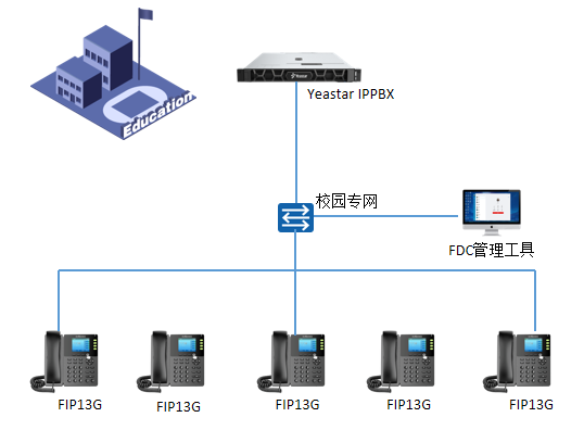 行政楼、教学楼、图书馆等桌面部署110台FIP13G话机,通过网络注册为 IPPBX 分机,并通过FDC软件快速完成话机数据配置、同步通讯录,进行统一管理。