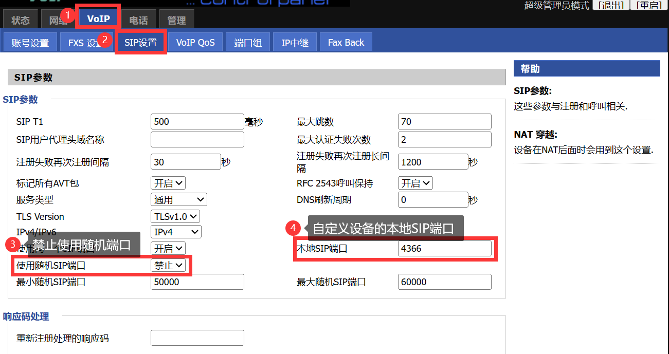 VoIP--》SIP 设置--》SIP参数--》配置固定端口