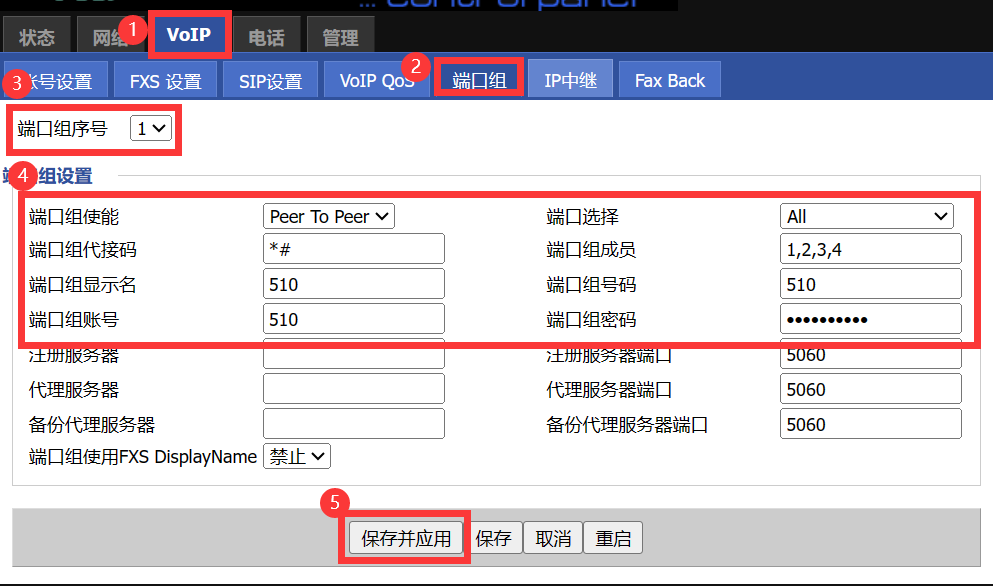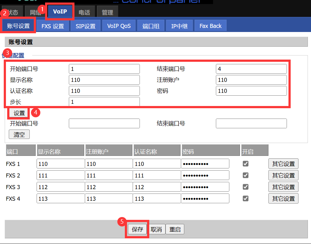 VoIP--》账号设置--》填写端口号信息--》保存