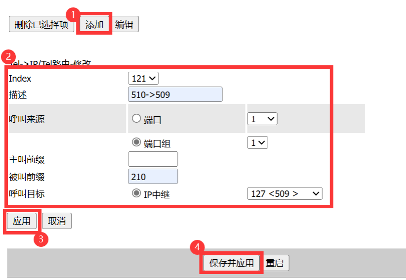 VoIP--》IP中继--》Tel->IP/Tel路由--》添加--》填写路由信息--》应用--》保存并应用
