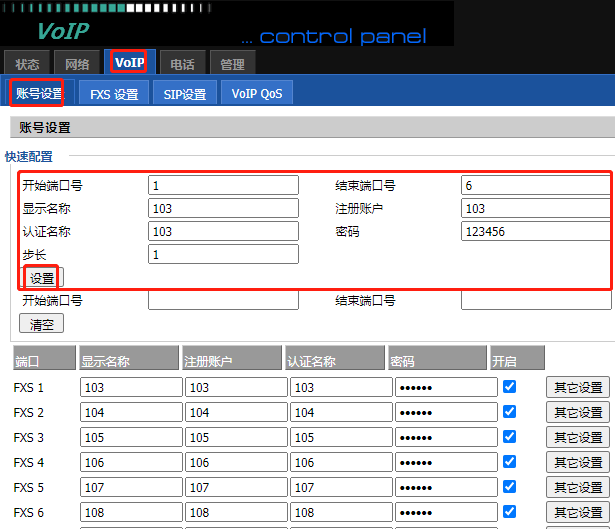 3.2 选择“VOIP”--“账号设置”,填写对应的开始端口号和结束端口号,显示名称,注册账户,认证名称,密码和步长,点击“设置”,页面会出现对应的分机条目,点击“保存”。
