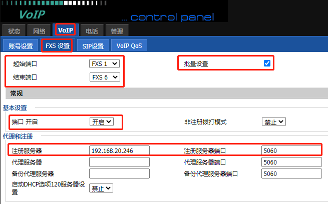 选择“VOIP”--“FXS设置”,选择对应的起始端口和结束端口,勾选批量设置,开启端口,输入注册服务器地址和端口号,点击保存并应用。