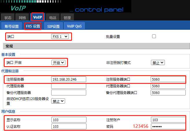 选择“VOIP”--“FXS设置”,选择对应的端口,开启端口,输入分机号码和密码,端口,服务器地址等信息,点击保存并应用。