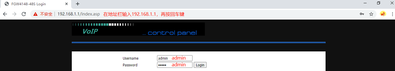 1、登录话机Web页面1.1 调试电脑打开浏览器,在浏览器地址栏输入网关IP地址:192.168.1.1 ,