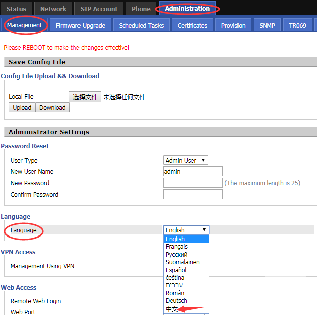 登录设备web界面,在“Administration-->Management”页面,选择要修改的语言后,点击下方Save,如图所示。