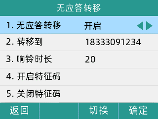 方法1:通过话机按键开启无应答转移功能。