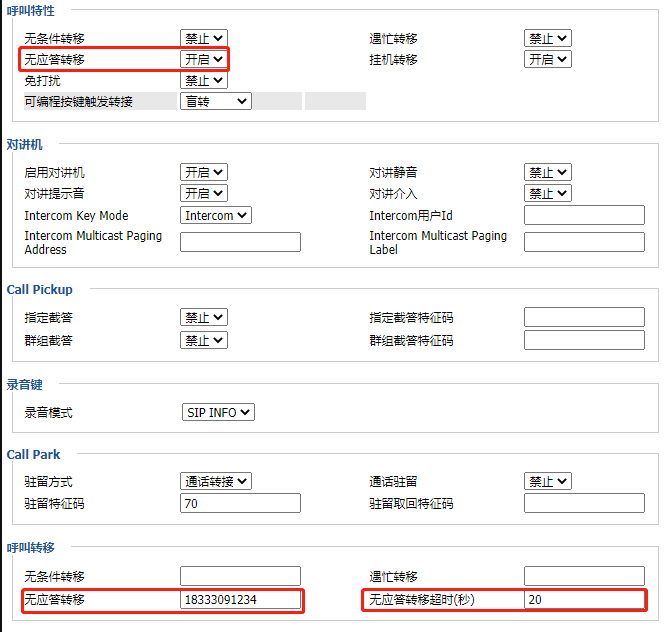 问题描述:来电呼入到话机,在无人接听的时候把来电自动转呼到手机。