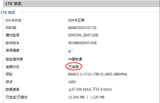 在"状态-->信息"界面,可以看到LTE状态。连接状态为已连接,表示SIM卡移被检测,连接成功。