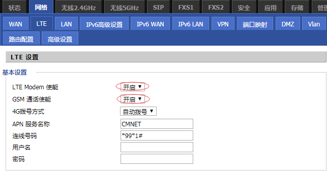在“网络-->LTE”界面,开启GSM通话使能,点击保存并应用,这时,可以设备可以正常上网,接在电话端口的模拟话机(固定电话)可以实现外线电话的呼入和呼出。