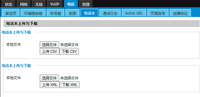 本地电话本是用户通过按键输入、web添加或上传电话本文件的方式(如下截图),将联系人信息导入到话机存储空间的一种方式。
