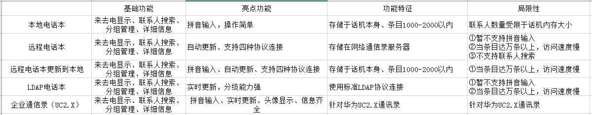 企业通讯录(UC2.X)是我司研发而成根据华为UC产品的企业通信录接口进行适配开发,目前已完成UC2.X版本的企业通信录接口功能,包括联系人头像显示、联系人搜索、来去电显示、部门信息显示等等。