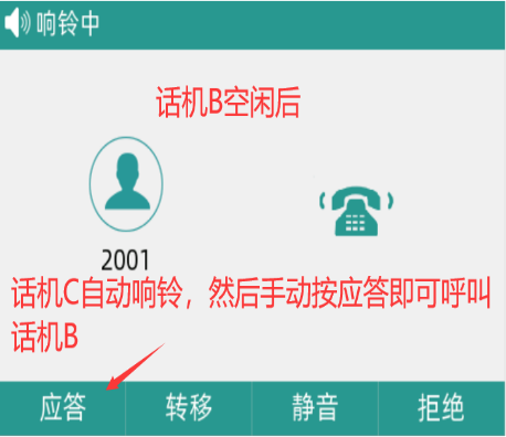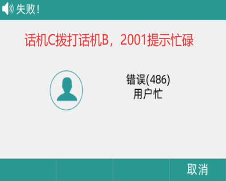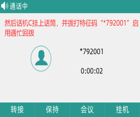 1、话机A和话机B进行通话,话机C拨打话机B提示忙碌,然后话机C挂上话筒输入“*792001”并听到成功的提示音,话机B空闲后,话机C正常响铃,并按应答键可自动呼叫话机B,且接通后可正常通话。