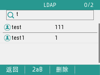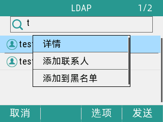 · 查找联系人:在 “电话本” 界面,输入数字或字母,话机会按照一定的规则到LDAP服务器上查询联系人并显示。用户可以选择某个联系人发起呼叫,也可以在选项中查看联系人详情和把联系人保存到本地。