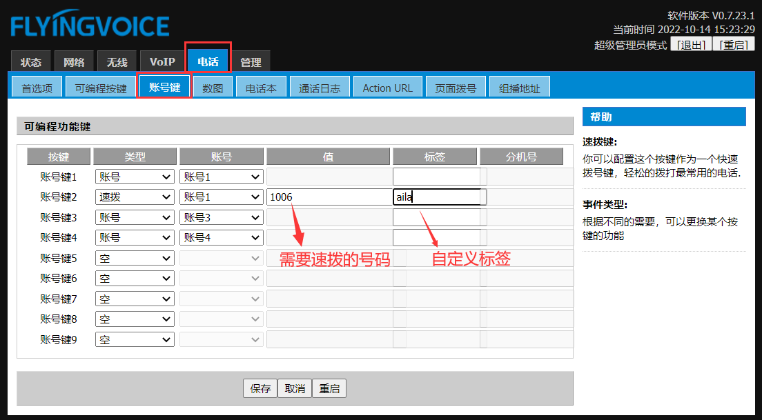 然后进入【电话】-【账号键】-【账号键2】,通过下拉框选择到【速拨】功能,然后填写相关信息,点击保存即可设置完成。