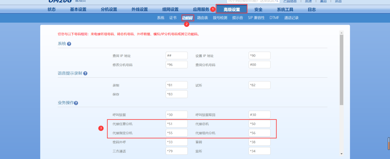 3、点击【高级设置】-【功能码】-【业务操作】找到代接配置选项,设置代接码,代接码为唯一标识,可自定义。