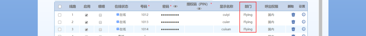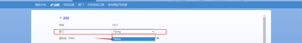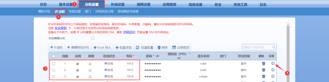 5、部门设置完成之后,再将分机添加到部门,找到【分机设置】-【IP分机】点击“④”设置。