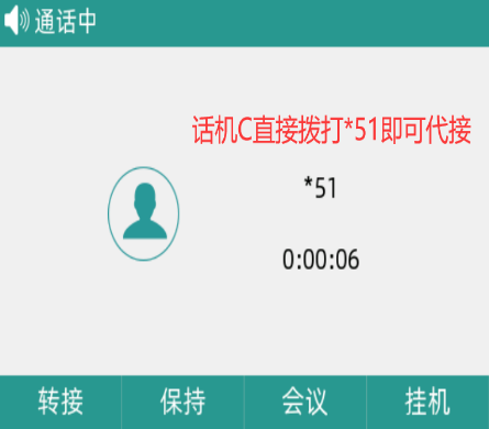 使用话机A拨打话机B,话机B响铃时,话机C直接按键“*51”,可将话机B的来电代接。如下图: