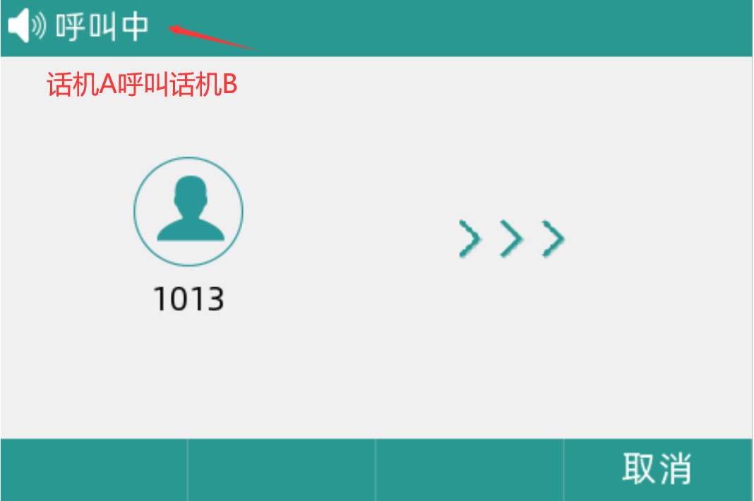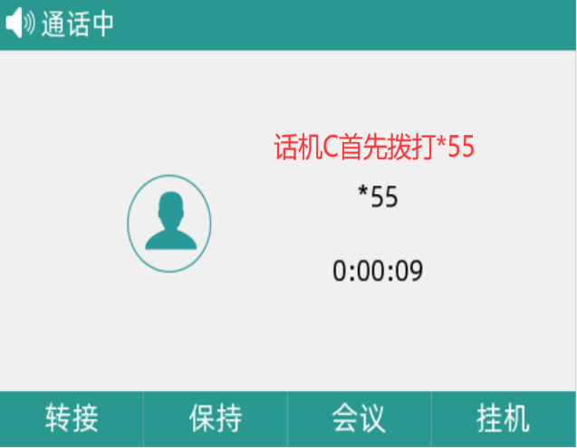 使用话机A拨打话机B,话机B响铃时,话机C首先拨打“*55”,然后输入话机B的分机号, 可将话机B的来电代接。如下图: