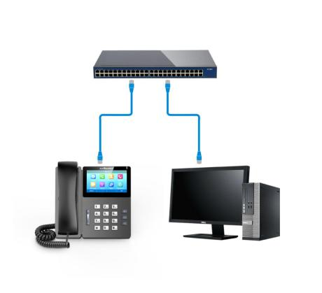 按照如下拓扑图连接话机和电脑,在话机屏幕上找到话机的IP地址,用这个IP地址登入话机的管理界面。