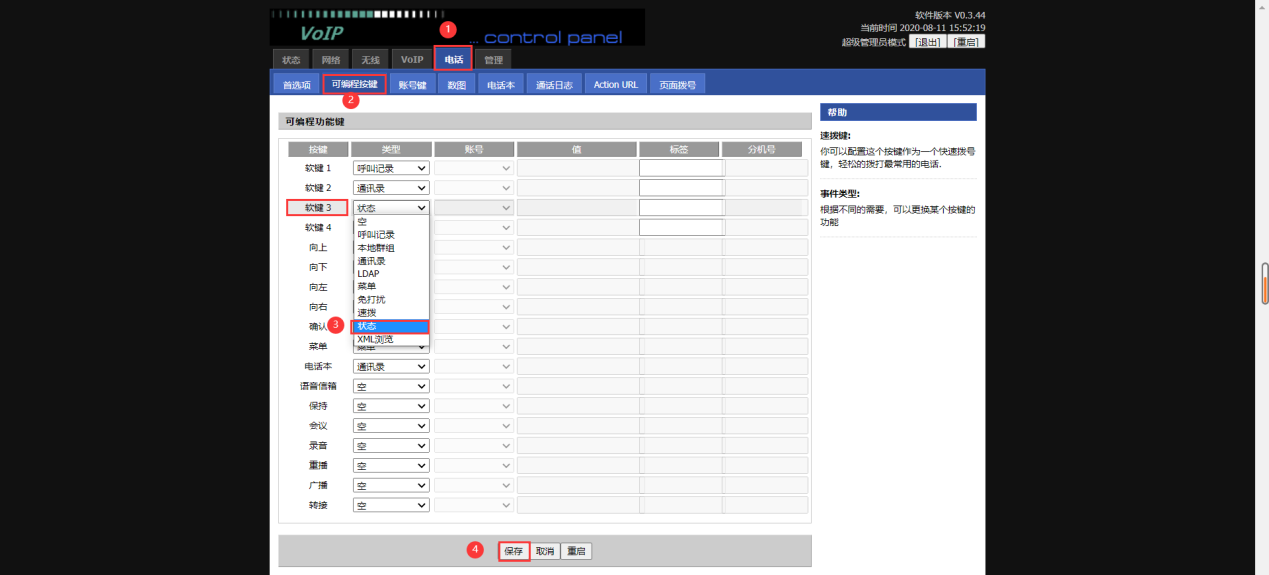 然后进入【电话】-【可编程按件】-【软键3】,通过下拉框选择到【状态】功能,然后点击保存即可设置完成。