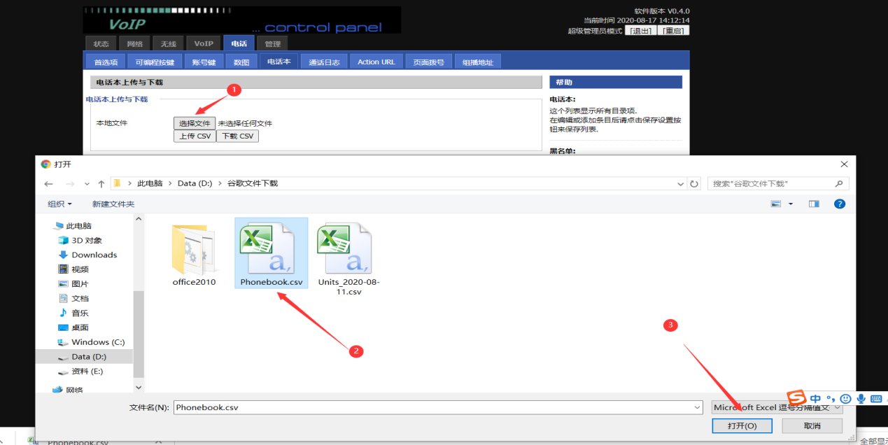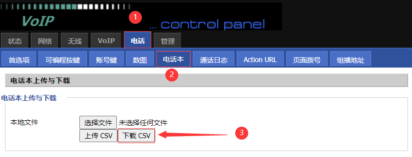 2.2 然后进入【电话】-【电话本】-【电话本上传与下载】找到【下载CSV】下载模板。