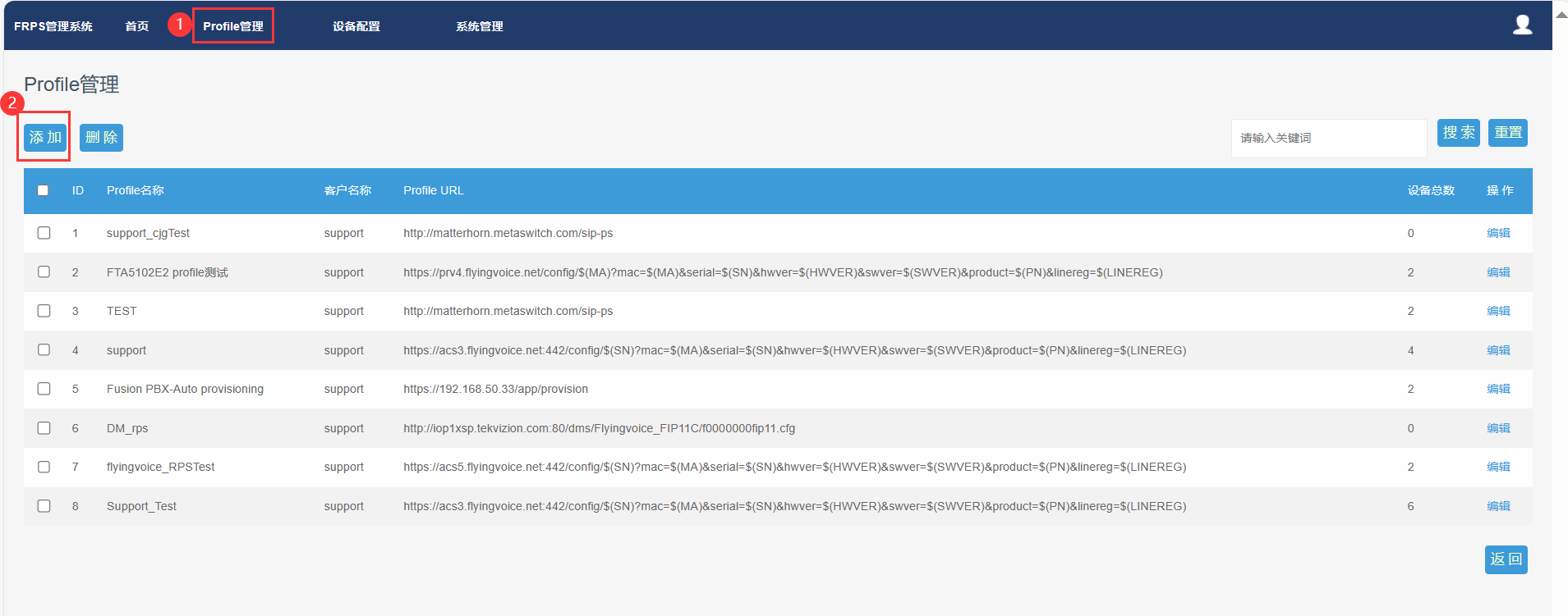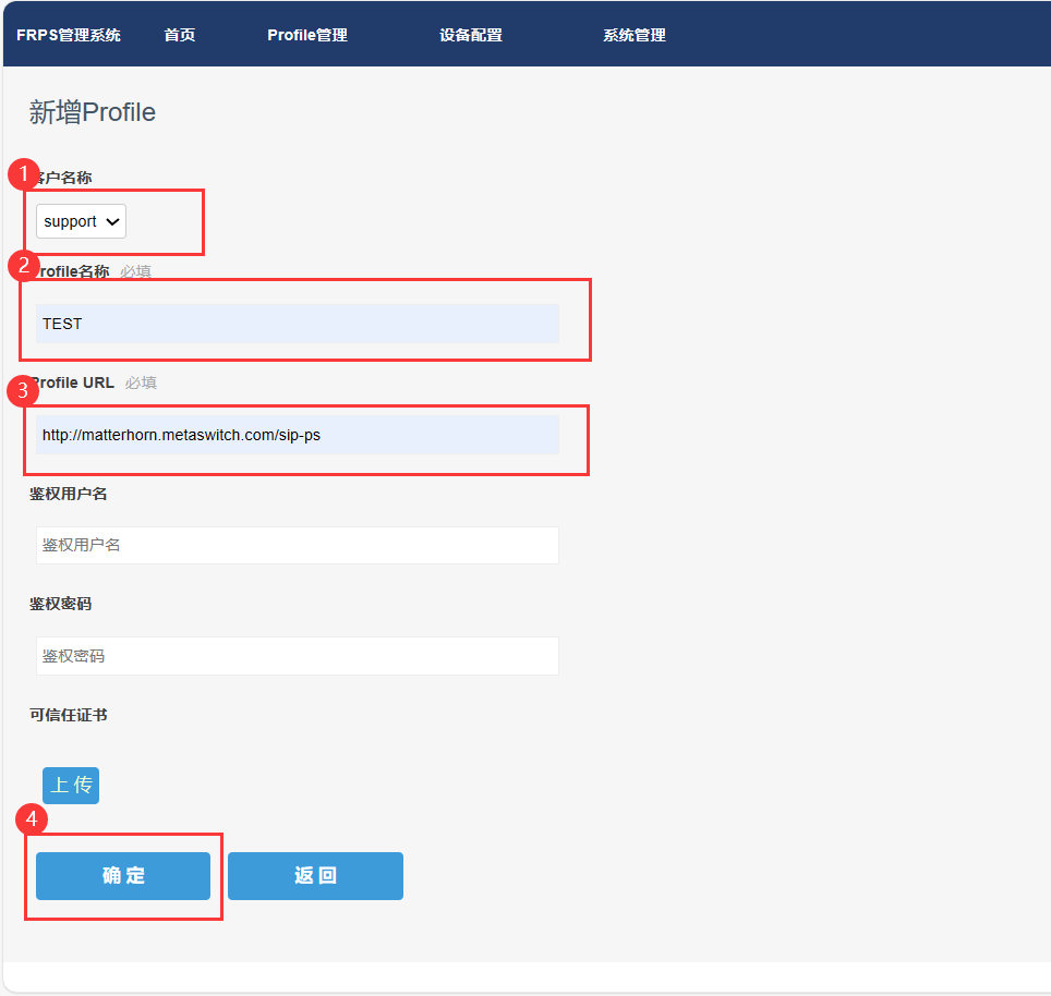 在FRPS平台上添加新的Profile,填写Metaswitch平台自动部署的URL。