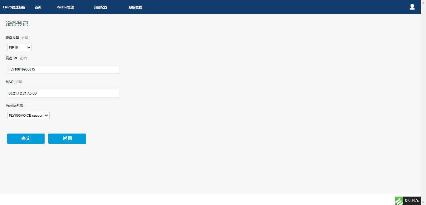 单台“登记”:选择您的设备类型,输入正确的设备SN和MAC地址,勾选Profile名称,点击确定。登记参数如下: