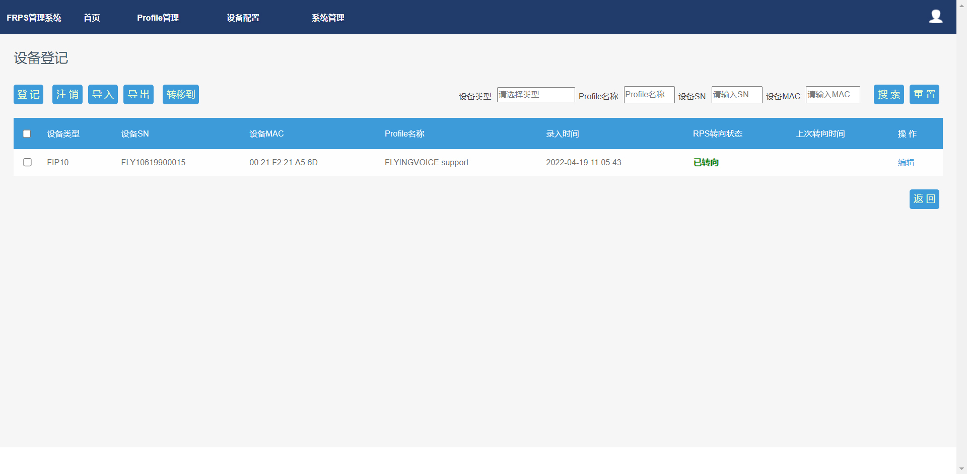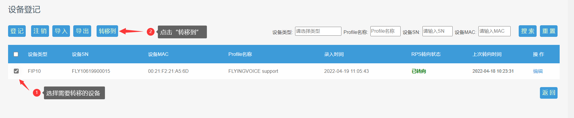 已经成功导入的设备,你可以根据需求对设备进行“导出”、“编辑”、“转移绑定的Profile”和“删除”等操作。其中“转移绑定的Profile”的操作方法如下: