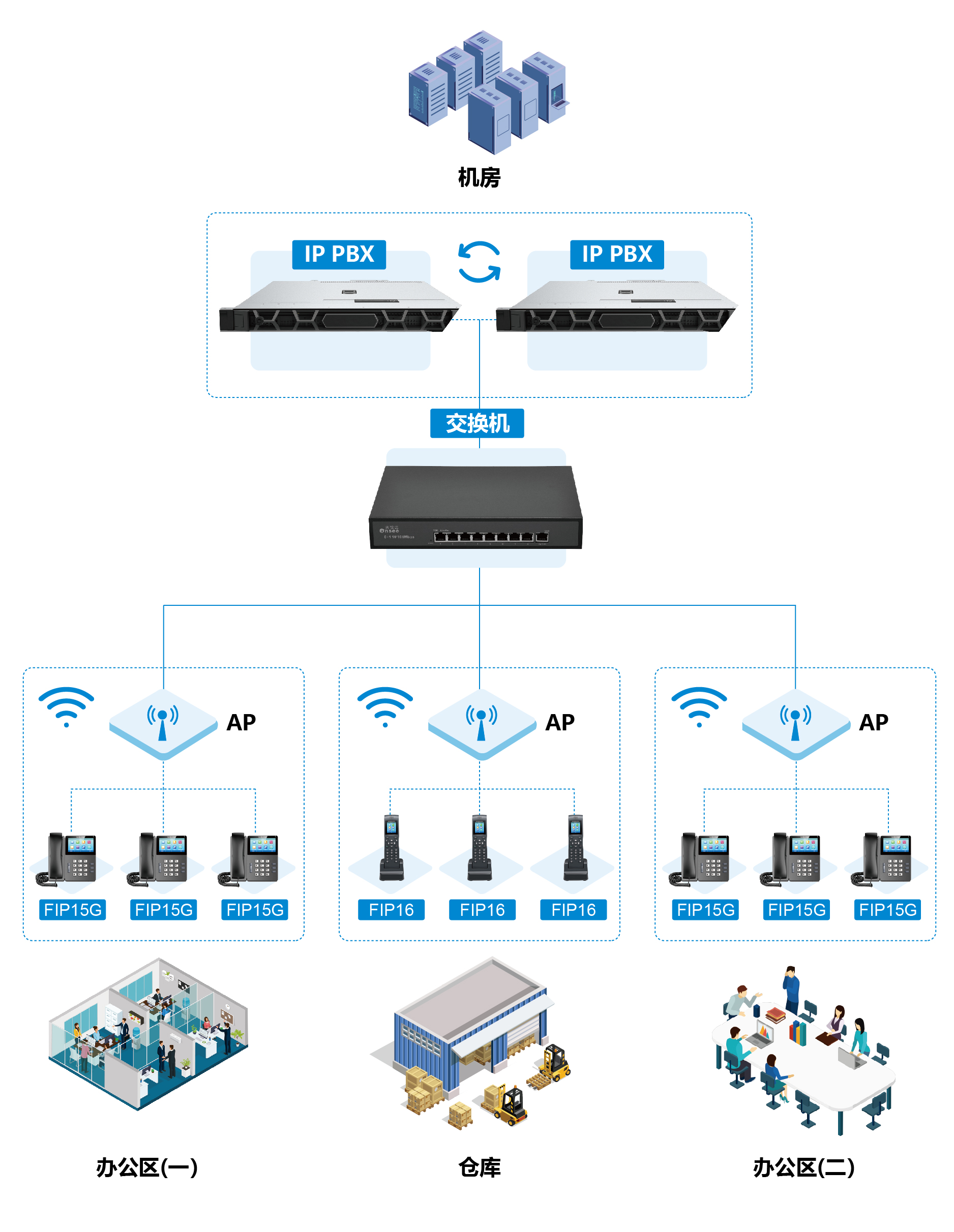 基于ITB8888通博时代IP话机无线部署的特性而推出的企业无线IP语音通讯解决方案,非常适用于需要保证新建办公室美观整洁,旧办公室不具备延伸电话与网络线路条件,企业后期按需进行扩容等情况。话机连接上办公室无线网络后,自动获取IP地址,完成分机注册,采用IP直拨方式进行内部免费通话。对于需要在车间、仓库、门卫室等区域频繁移动的人员,可为其配备ITB8888通博时代便携式移动话机,2.4GHz&5GHz双频无线接入,确保了通话的稳定性,同时支持IEEE802.11k/r,可实现跨AP快速漫游,自由走动通话不受限。