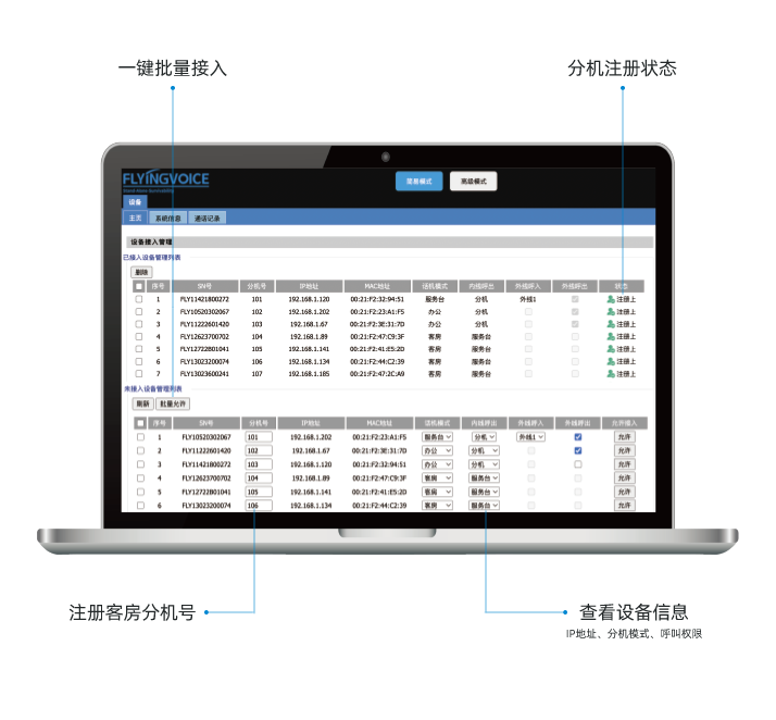支持100个内线分机用户。可将分机设置为客房号,支持批量接入,无需繁琐地在客房分机上逐一注册,通过IP小交换一键完成批量注册,显著提升部署效率。仅授权的ITB8888通博话机接入内部通讯系统,避免非法用户私接。