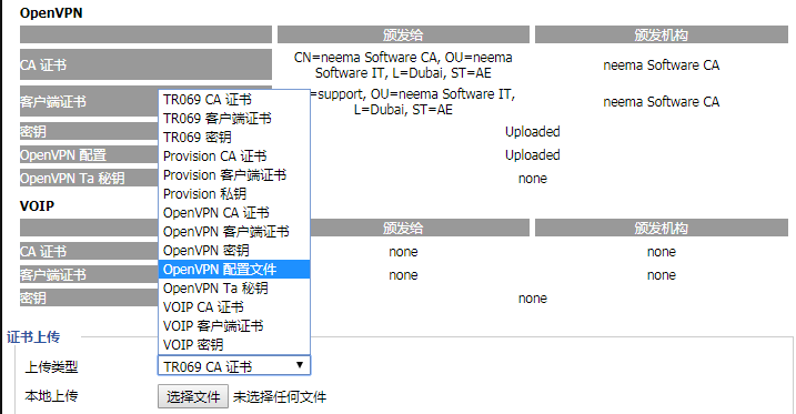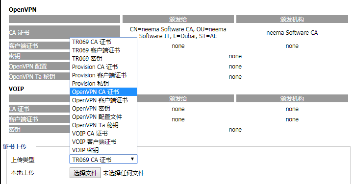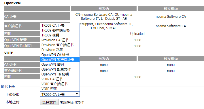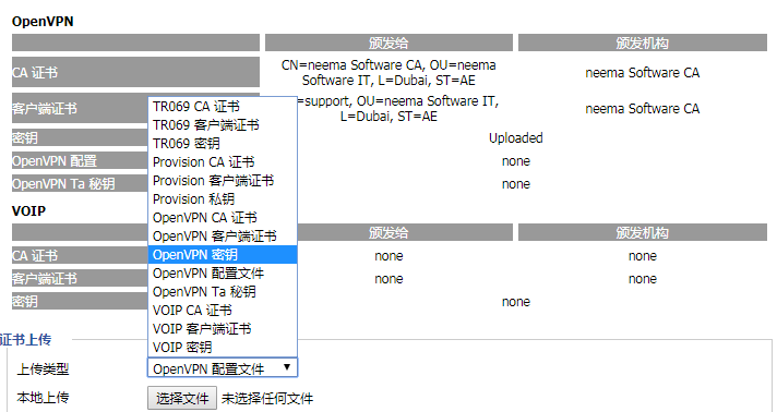 单击“上传类型”下拉菜单选择“OpenVPN CA 证书 ;单击“本地上传”然后选择‘ca.crt’文件,然后单击“升级”开始上传CA cert. 按照此操作完成下面的文件上传步骤。